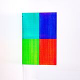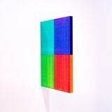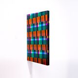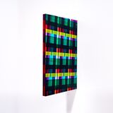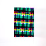 As oblique grids they are constructed from varying widths and intervals of translucent, rhythmic colour, locking the viewer’s gaze in a geometric matrix. Like the pastime of gazing out of a window, perhaps this window allows for quiet contemplation and dreams of another time.